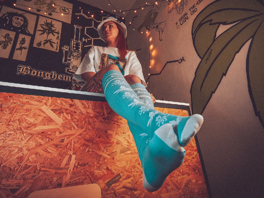 The minimalist design of these knee-high socks easily combines with various styles and outfits, making them a versatile accessory for everyday wear. Whether you're going to a concert, a walk around town, or just chilling in the park, these knee-high socks will add the right 420 touch to your look.
